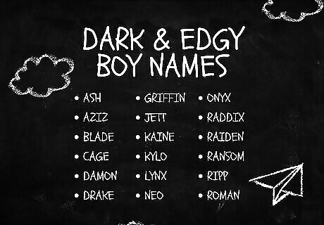 Go for something dark and mysterious. If you enjoy the darker things in life, why not choose a name that reflects your interests? Some of these names may have dark and edgy meanings, while others simply sound brooding and mysterious. Here are some examples: Ash (English for “of the ash tree”) Aziz (Arabic for “all-powerful”) Blade (English for “knife, sword”) Cage (English for “confining structure”) Cassian (Latin origin; “hollow” or “vain”) Damon (Greek for “one who tames, subdues”) Drake (English for “dragon”) Griffin (Welsh for “lord, prince”) Jett (English for “jet black”) Kaine (Irish for “battle”) Kendrix (Welsh for “greatest champion”) Kylo (American for “sky”) Lynx (Greek for “brightness”) Neo (Latin for “new”) Onyx (English for “black gemstone) Raddix (American for “roots”) Raiden (Japanese for “thunder and lightning”) Ransom (British for “warrior’s shield”) Ripp (Dutch and English for “strength, bright, famous”) Roman (Latin for “citizen of Rome”) Ryker (German for “rich”) Slade (English for “valley”) Storm (English for “storm”) Talon (English for “claw”) Thorn (English and German for “spike on a plant”) Xavion (American for “new house”) Looking for more dark name ideas? Check out our Emo Names article!