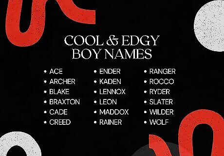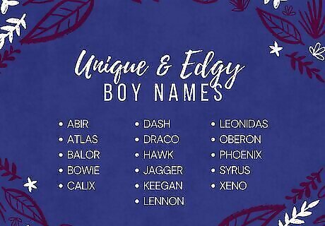 Stand out with a unique name. Many edgy names are inspired by objects or words that aren’t typically used as names. Because of this, it’s pretty easy to come up with a unique idea. You can also draw inspiration from your favorite characters or rock stars for an interesting name. Here are some examples: Abir (Hebrew for “strong, brave”) Arlo (English for “armed hill”) Atlas (Greek for “bearer of the heavens”) Balor (Irish for “the deadly one, the powerful one”) Bodhi (Sanskrit for “awakening, enlightenment”) Bowie (Scottish for “blond”) Briar (English for “shrub, small tree”) Bronx (American for “Bronck’s Land”) Calix (Greek for “very handsome”) Cosgrave (Irish for “victorious champion”) Dash (English for “to run quickly”) Draco (Latin and English for “dragon”) Hawk (English for “falcon, bird of prey”) Jagger (English for “carter”) Keegan (Irish for “small fire, descendant of the fiery one”) Lennon (English and Gaelic for “lover”) Leonidas (Greek for “son of the lion”) Mercer (French/English origins; “merchant”) Oberon (English for “noble, bearlike”) Phoenix (Greek for “dark red”) Syrus (Persian for “sun, like the sun”) Xeno (Greek for “strange voice”) Zaccai (Hebrew for “just, fair”) Zayden (American for “increasing”) Zephyr (Greek for “west wind”) Zeppelin (English for “airship”)