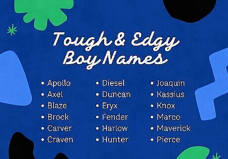 Choose a name that’s tough and masculine. Part of what makes edgy boy names, well, edgy is how strong and tough they sound. Go for a masculine name with a powerful meaning, like one of the following: Apollo (Green for “destroyer”) Axel (Scandinavian for “my father is peace”) Blaze (Latin for “stutter”) Brock (English for “badger-like”) Carver (English for “one who carves wood”) Craven (English for “garlic place”) Diesel (German for “fuel”) Duncan (Gaelic for “dark warrior”) Eryx (Greek for “boxer”) Fender (English for “from the defender”) Harlow (English for “army hill”) Hunter (English for “one who hunts”) Joaquin (Spanish for “God will judge”) Kassius (Latin for “helmeted warrior”) Kaz (Slavic for “famous destroyer of peace”) Knox (Scottish for “round hill”) Marco (Spanish and Italian for “warlike”) Mars (Greek for “god of war”) Maverick (American for “independent one”) Pierce (English for “rock”) Reign (English for “rule, sovereign”) Sirius (Greek for “burning”) Tormund (Scandinavian for “Thor’s protection”) Victor (Latin for “winner, conqueror”) Wyatt (English for “strong in war”)