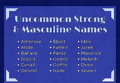 Choose a rare name if you want to stand out from the crowd. Depending on where you live, some powerful boy names will be more unique than others. Consider honoring your culture by choosing a name from your ethnic background, or simply go for something that sounds cool. For instance, Coffey suggests choosing a name with traditionally masculine associations, like Gunnar (associated with “gun”), Cash (related to a man being the provider), or Ford (associated with cars). Some other unique examples include: Ambrose (Greek for “immortal”) Amell (German for “power of an eagle”) Ande (African for “pillar”) Ansaldo (Italian for “power, leader”) Ballard (Scandinavian for “brave, strong”) Barrett (German for “strength of a bear”) Bidziil (Navajo for “he is strong”) Burke (English for “fortress”) Conall (Irish for “strong wolf”) Denzel (English for “high stronghold”) Ebert (American and German for “brave boar”) Farrell (Irish for “man of valor”) Farris (Scottish for “masculine strength”) Godric (English for “God’s ruler”) Griffin (Welsh for “strong prince”) Haile (Ethiopian for “power, force”) Idris (Welsh for “ardent lord”) Jarek (Slavic for “fierce, strong”) Maverick (English for “independent”) Melech (Hebrew for “king”) Orion (Greek for “heaven’s light”) Sewell (English for “strong sea”) Valente (Latin for “strong, healthy, brave”) Warrick (German for “leader who defends”) Wayan (Balinese and Sanskrit for “energy, strength”)