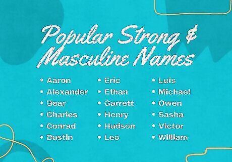 Choose a classic name for a popular option. If you’re looking for popular masculine names, you usually can’t go wrong with something classic and traditional. Many of these names have been around for generations and often have strong meanings, like “brave,” “protector,” or “ruler.” Here are some of our favorites: Aaron (Hebrew for “high mountain, exalted”) Aiden (Irish for “little fire”) Alexander (Greek for “defending man”) Andrew (Greek for “strong, manly, courageous”) Augustus (Latin for “majestic, venerable”) Bear (English for “the brown one”) Charles (German for “free man”) Cliff (English for “steep rock face”) Conrad (German for “brave counsel”) Cyrus (Greek for “lord”) Dustin (Norse for “brave warrior, Thor’s stone”) Eric (Norse for “sole ruler”) Ethan (Hebrew for “solid, enduring, firm”) Garrett (Irish for “spear strength”) Henry (German for “house ruler”) Hudson (English for “son of Hugh/Hudd”) Leo (Latin for “lion”) Liam (Irish for “helmet of will, protection”) Luis (Spanish and Portuguese for “famous warrior”) Michael (Hebrew for “who is like God?”) Owen (Welsh for “noble-born”) Sasha (Russian for “defending man”) Victor (Latin for “conqueror”) William (German for “will helmet”) Wyatt (English for “battle, brave, hardy”) Meet the wikiHow Experts Lacey Coffey is a baby name expert who started the viral account "Soft Baby Names." She has dual degrees in religion and intercultural studies and teaching English (with a focus on linguistics). Her studies directly influence her name research and interests. Chloe Hodgson is a baby name expert based in the UK. She began building her community on Instagram in 2018. Sonya Prior is a name consultant known as the BB Namer based in Auckland, New Zealand. She currently has over 30k followers across Instagram and TikTok.