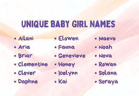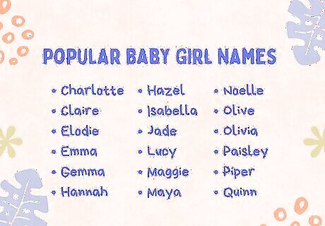 Consider popular, trendy options. Take a look at some of the current trendy baby names to see if any speak to you. Dr. Wilson says, “Today’s parents are more open to names from different cultures… and names that feel emotionally resonant rather than just traditional.” Keep an open mind when choosing a name for your baby—you never know what you’ll find! Here are some popular options: Charlotte (French for “free man”) Claire (French for “bright, clear”) Elodie (French for “foreign riches”) Emma (German for “whole, universe”) Gemma (Latin for “gem, jewel”) Hannah (Hebrew for “favor, grace”) Hazel (English for “hazel tree”) Isabella (Hebrew for “devoted to God”) Jade (English for “precious stone”) Lucy (Latin for “light”) Maggie (Greek for “pearl”) Maya (Sanskrit for “illusion, magic”) Noelle (French for “Christmas”) Olive (Latin for “olive tree”) Olivia (Latin for “olive tree”) Paisley (Scottish for “church”) Piper (English for “pipe player, flute player”) Quinn (Gaelic for “descendant of Conn, descendant of the chief”) Stella (Latin and Italian for “star”) Violet (Latin for “purple flower”)