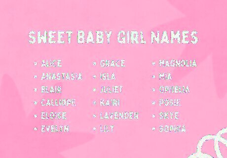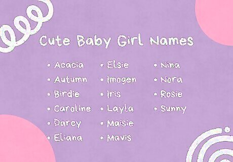 Pick a name that’s as adorable as your baby. A lot of cute baby girl names are on the shorter side and end with a vowel—this makes them sound really sweet and feminine. Here are some of the cutest names to choose from: Acacia (Greek for “thorny”) Adeline (German for “noble”) Autumn (Latin for “fall, season of harvest”) Ava (Latin for “bird, birdlike”) Birdie (American for “little bird”) Caroline (French and German for “free man”) Darcy (Irish for “dark-haired,” French for “from Arcy”) Eliana (Hebrew for “God has answered”) Elsie (Hebrew for “pledged to God”) Imogen (Celtic for “maiden, daughter”) Iris (Greek for “rainbow”) Layla (Arabic for “night, dark beauty”) Maisie (Scottish for “pearl”) Mallory (French for “unlucky”) Mavis (French for “songbird”) Melody (Greek for “music, song”) Nina (Spanish for “little girl”) Nora (Latin for “honor”) Rosie (Latin for “rose”) Sunny (English for “sunshine, happy, cheerful”)