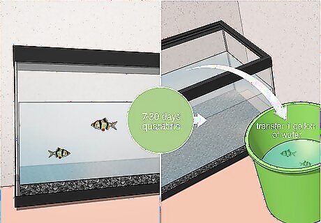 Put all new fish into this tank. After 7-30 days of no symptoms, drain some of the water into a bucket (1 gallon is fine) and you net the fish into the bucket. The time frame depends on the life cycle of parasites and the temperature of the water. Higher temperatures mean a shorter life cycle and less time in the quarantine tank.