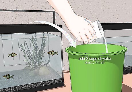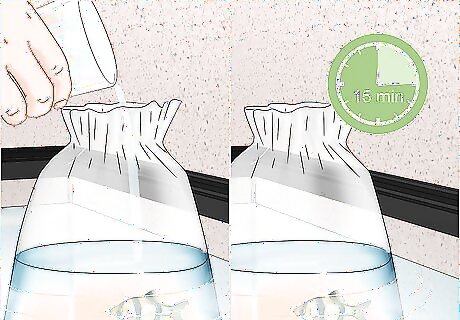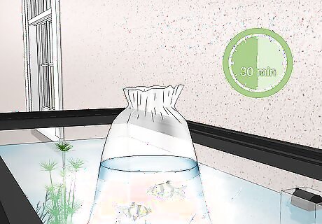 Float the bag on the water for 15–30 minutes. Untie the bag, and then place the bag carefully to prevent the water in the bag from mixing with the tank water. If the bag doesn't float and keeps tipping over, tape one side of it to the side of the tank. The water in the bag will gradually change temperature to match the tank, preventing injury and death from a sudden temperature change. If the bag is untied, you can wait a full hour to be cautious.