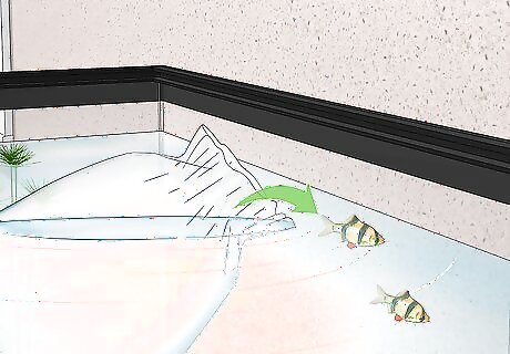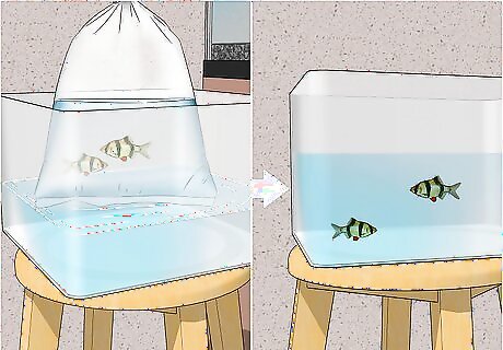 Transfer the fish without pouring in water. You can either tip the majority of the water from the bag into another container and then let the fish swim from the bag into the tank or tip the bag at an angle, allowing the fish to swim out. Then dispose of the rest of the bag water elsewhere. Water from the bag may contain microorganisms or chemicals that damage your other fish. If you don't feel comfortable adding any of the water from the bag into the tank, scoop up the fish with a small net and place it in the tank.
