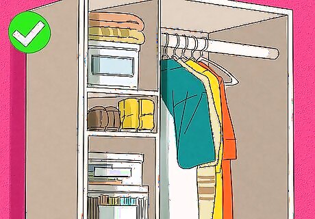 Keep items that need to be together stored near each other. For example, on a bookshelf, you may want the first shelf to have all the books and the second shelf for all the magazines. Storing items this way makes it less complicated to search for the things you need ahead of time. Examples include: The top shelf in a closet having all the blankets, the second shelf having all the shoes. One box storing all your comics, the second box storing all your novels. One drawer storing all your socks, another drawer with all your shirts.
