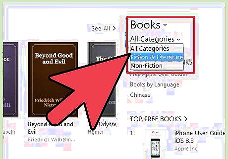 Access the "Books" section of the iTunes store options list. To do so, either click directly on the "Books" title of the iTunes store options list, or click and hold the "Books" section of the iTunes store main window to activate the drop down menu of options for you to search for the specific book you want to add to your iTunes library. The search options allow search options include prices of the book, forms of the book (i.e. audio books), and subject matter of the books.