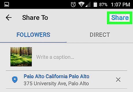 Tap Share. It’s at the top-right corner of the screen. Your photo or video now appears in the feed with its location.
