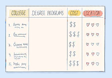 Research schools’ admissions standards and requirements. Take advantage of admissions websites and college review sites, where you can learn all about potential schools. Look for colleges and universities that have features that appeal to you, such as degree programs, cost, class size, and location. Many college review sites compile lists of colleges that you can browse. They break down how hard it is to get into a school, what kind of SAT or ACT score you need, tuition cost, what campus life is like, and how many alumni get jobs after graduating. You can find plenty of information on schools’ websites, but you could also ask colleges and universities to send you information packets. Check out admissions websites and look for “request information” links.