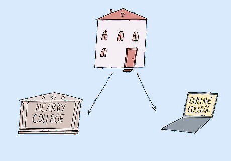 Look for nearby or online universities if you want to stay local. Look into nearby colleges and universities if you have a job you don't want to leave or just want to stay close to home. An online degree program could also be a great option, especially if you're returning to school. In the United States, lower tuition cost is one major perk of in-state public colleges and universities. Talk to your family about the pros and cons of moving away versus staying local. Discuss costs, responsibilities that require you to stay close to home, and other logistics.