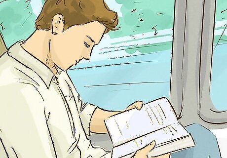 Read a book. This shows that you are occupied and makes the other person decide whether what they have to say is important enough to interrupt you. This also demonstrates your lack of interest because you are both looking down and engaging in another activity. It also gives you a good way out of a conversation on the off chance that they do interrupt you. You could say something like, “I’m sorry but I need to get back to my book now. I’m dying to know what happens next!” The other person will likely accept this and allow you to go back to reading. Sometimes this can backfire, for example, if someone else really likes to read and wants to ask you about your book. In case this happens, keep your responses brief to show that you aren’t interested in talking about your book, but prefer to read it. If they don’t get the hint, you can always say something like, “It was great talking with you but I’m going to return to my book now. I really want to finish this chapter.” If the other person is a reader, they will likely understand.