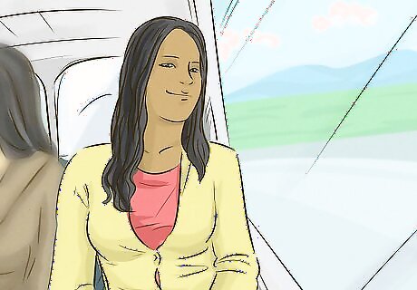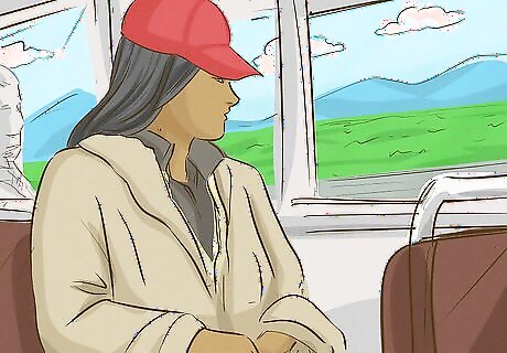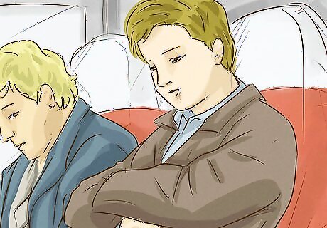 Look away. When you sit down, make sure to keep to yourself, avoiding eye contact. If you make eye contact with other passengers, you will give the impression that you are open to interacting. It is best to either look down, look out the window, or you can even rest your head against the window and close your eyes. People will think you are sleeping and will hesitate to interrupt you.