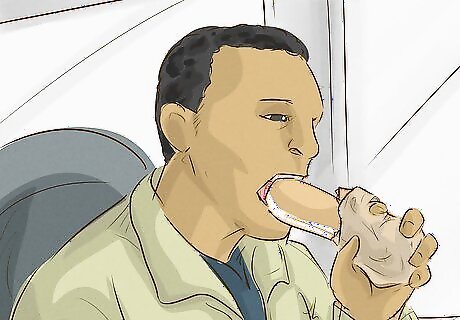 Eat something. Have a snack while you are riding public transportation. It’s quite difficult to talk with a full mouth. If someone interrupts you mid bite, they will have to wait for you to chew and swallow, which makes for a slow and frustrating conversation. You can even exaggerate this a bit and take a long time chewing before you respond, then immediately take another bite. They will likely give up and find someone else to talk to. Try eating an apple. You can take big bites and chew slowly so that people see you aren’t able to talk.