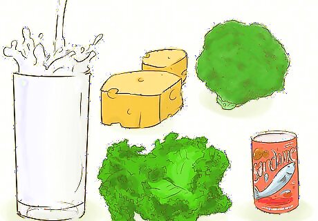 Follow vitamin and nutrient guidelines. Beyond the main nutrient groups, you need to receive adequate amounts of calcium, iron, vitamin C, and folate during your pregnancy. Many people choose to take prenatal vitamins to supplement their diets. Here are the vitamin guidelines and a few foods where you can find these nutrients: 1000-1300 milligrams of calcium. Dairy products, like full cream milk and yogurt, and dark greens are good sources of calcium. 27 milligrams of iron. You can find iron in meats, fish, beans, and spinach. 80-85 milligrams of vitamin C. Citrus fruits (like oranges), melons, broccoli, cauliflower, and green peppers are good sources of vitamin C. 0.46 milligrams of folate. Folate, also called folic acid, can be found in dark green leafy vegetables and legumes.
