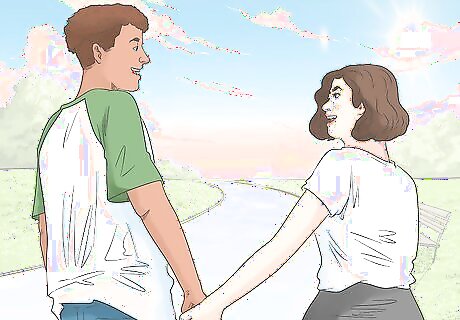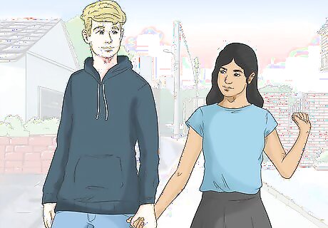 Hold hands in public. Hold hands while you walk through the halls at school. Hold hands while you sit at sporting events. Sit by each other on the bus and hold hands while you ride. Anytime you are around your friends or in public, hold hands so people know you are a couple. Holding hands can be an exciting step in the early stages of a relationship. In middle school and high school, people who are holding hands are almost always seen as a couple.
