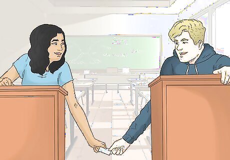 Pass notes at school. Pass notes when you see each other in the hall. Reading them will entertain you during class. Find sneaky ways to pass your notes during class, like rolling the note up and putting it inside a pen. Put a note in a gum wrapper and pass it. You might get caught, so don’t include anything too private in your notes. If the teacher catches you and reads your note, you might be embarrassed if you write secrets.