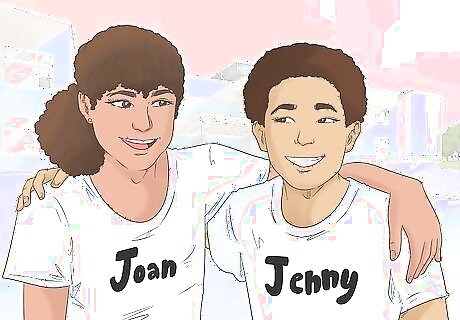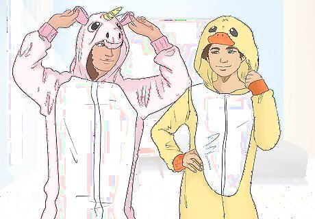 Dress in matching costumes for parties or dress up days. Any chance you get to wear a costume is a perfect opportunity to match. Select a famous character couple from a book, TV, or movie. Dress up as different versions of the same character or theme. Be sure it’s obvious that your costumes go together. Look at costumes that people have already designed or come up with an original idea and design it yourself. For example, you could dress up as Ash and Pikachu from Pokémon, Red Riding Hood and the Wolf, or a slice of pizza and the pizza delivery guy.