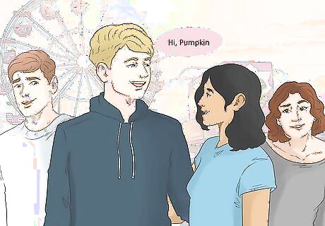 Use special nicknames in front of other people. Come up with cute nicknames that reveal something about your relationship. Use these names when you are calling to each other across the room or when you talk on the phone. Nicknames can be simple like sweetie, pumpkin, honeybunch, or love. Make your nicknames more specific by incorporating your real names. For example, on How I Met Your Mother, Marshall and Lily call each other Marshmallow and Lilypad.