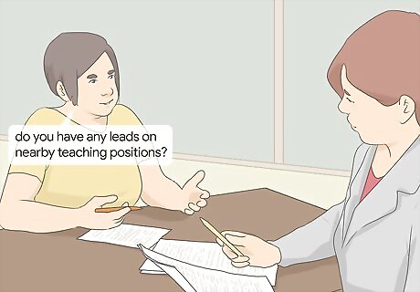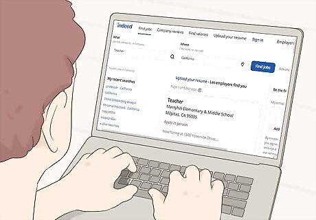 Ask your school or certification program for leads on open positions. To start looking for work, ask your certification program if they have any leads on nearby teaching positions. Most programs will help you land interviews and many programs host job fairs for graduating students. Go to any job fairs and approach hiring managers to discuss open positions and follow up on any leads your program gives you. Many of the professors in collegiate Education programs taught in high school or elementary school. Ask your old teachers if they know of any open positions that might be a good fit for you.
