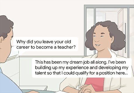 Connect your prior work experience to teaching skills in your interview. During interviews, connect your prior experience to teaching skills as best as you can. Explain how management skills transfer to classroom management and how your interactions with customers can translate to interactions with students. How you do this is highly dependent upon your previous line of work, so pick 3-4 skills ahead of time that you can discuss in your interview. At every interview, you will be asked, “Why did you leave your old career to become a teacher?” Prepare a meaningful response to this question ahead of time to ensure that you aren’t thrown off. This is an important question for schools since your values and beliefs must align with the school’s mission if you’re going to work there. Even if you were a delivery driver, explain your past experience as preparing you to work long hours, stay focused, and complete job requirements. There is always some connection that you can make, even if it isn’t completely obvious at first.