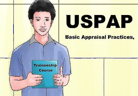 Become certified as a trainee appraiser. To become a trainee, you must first take certain courses, including USPAP, Basic Appraisal Practices, Basic Appraisal Procedures, and a Supervisor/Trainee course. You can then apply for a traineeship from a certified appraiser. If you cannot find any traineeships in your area, you might check if your state offers a formal training program. If they do not offer a training program, consider contacting a professional organization, such as the Appraisers Association of America, to see if they can connect you to a local supervisor.