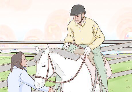 Take riding lessons from a qualified teacher. Start with barn chores at a quality stable first, if there is one nearby, to become familiar with horses and to get used to being around them. Many stables are happy to have a volunteer. In return they might let you ride their horses, and you will become acquainted with the horses, their temperaments, and body language.