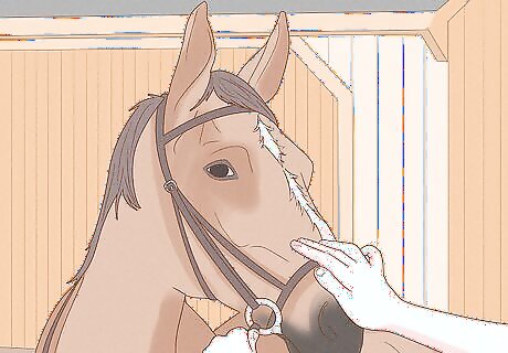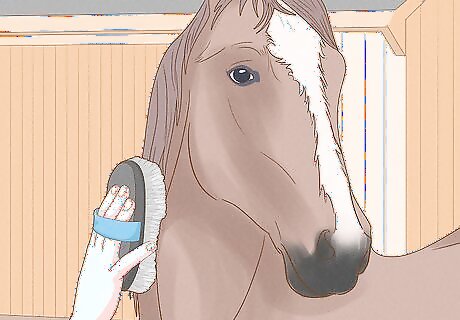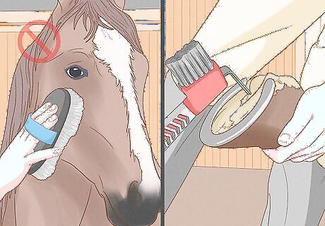 Brush horses properly. Use the curry comb, dandy (hard) brush, and body (soft) brush, in that order. The curry comb should be used on the neck, body, and about halfway down the horse's legs, and likewise for the hard brush. The body brush is the only brush that should be used all the way down to the horse's hooves. Do not brush the horse's face; use a towel or a grooming glove on this area. Pick up the horse's hooves and use a hoof pick to clean out dirt and mud if they appear to be dirty. Pick them up from the side, never stand directly behind or in front of a horse's legs, for safety reasons.