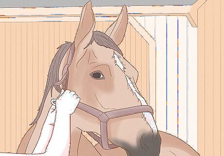 Catch and halter your horse. Catch or call your horse, and put on the halter. This is the leather or nylon harness that goes over the horse's head, and you will want to strap it tightly enough so it doesn't slip, but not tight enough to be uncomfortable for the horse. Ensure that it is completely on the horse's head; many an escaped horse could have been avoided had they simply ensured that the halter was on completely. Lead the horse into the barn and attach the cross ties to the metal ring on the halter near the horses mouth. If there are two rings, the cross ties should be clipped to the metal loops on the sides, closest to the horse's mouth.
