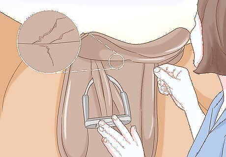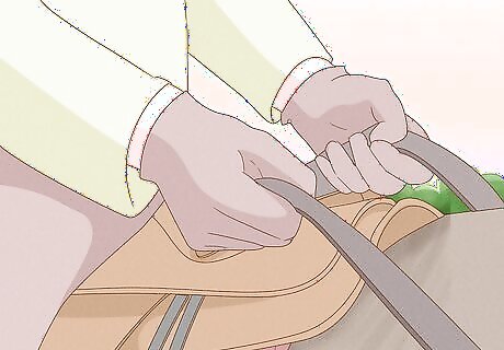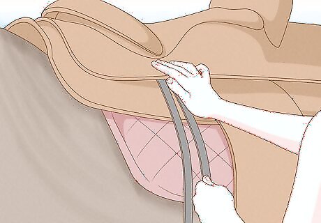Check all your gear thoroughly. Bring your tack out of the tack room, check it over to make sure it is clean and in good shape, with no holes or tears in the leather. Set it down, preferably on a rail, saddle rack, or stand. Ensure that it is out of the way of other riders.