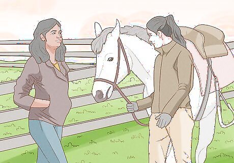 Learn to groom horses properly. This is important both in "bonding" with a horse, if you are fortunate enough to ride the same one regularly, and also gives you a chance to look the horse over for problems or injuries before and after a ride. Feed and water the horse if you have opportunity, once again cementing a bond with the animal, earning its trust, and learning to trust it, as well. Many people are surprised, when they find themselves "up close, and personal," with a horse; with how large and powerful they truly are.