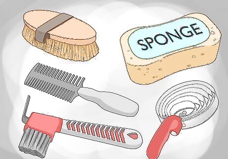 Buy a grooming kit. Brushing a horse helps blood circulation, lets the rider bond with the horse, and makes him clean and shiny. You should always groom a horse before going for a ride and after, before removes any dirt and prickles that may cause the horse to react as he is in pain. A basic grooming kit should have: Curry Comb, used to remove dry dirt and excessive hair Dandy Brush, which is a stiff brush used to remove mud and hard stains Body Brush, which is a soft bristled brush for bringing a shine and used on the face and delicate areas) Hoof pick, to remove mud and stones from hooves Mane comb, used to brush mane and forelock A sponge for cleaning the nose and eyes and removing sweat marks after riding