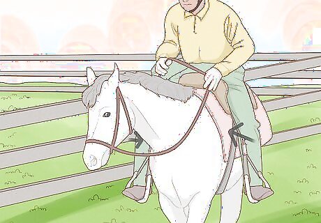 Use the reins to steer. Pull up the reins, and get each at equal length while holding them over the center of the horse's neck with its head. The reins are basically the "steering wheel" of the horse. To turn left, you pull the reins left, so that the bit puts pressure on the horse's mouth, cuing him to move away from the pressure, turning the horse's head in that direction. A second style of steering the horse involves the reins in two hands, where you hold one hand steady while the other exerts gentle pressure straight backwards, thus causing the horse to move away from the pressure, turning in response. The left hand is pulled back while the right hand is held steady, and so the horse turns to the left. It's important to always defer to your teacher's instructions when you're just learning. The specifics of guiding the horse into motion are complex and take lots of practice. Learn from an experience horse rider.