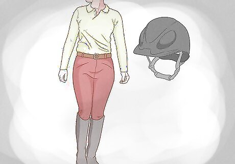 Purchase riding attire. This should technically be bought before the rider buys saddles, blankets, brides, bits and all those other equipment. This should probably be bought before a horse is bought or leased. The rider should have a helmet designed specifically for riding, that is ASTM/STI certified. Helmets such as bike helmets are not satisfactory, as riding helmets cover more of the head and are specifically designed for safety against falls while horseback riding. Boots should be flat-soled, preferably pointed, and they must have a heel, all to facilitate the easy removal of the boot from the stirrup should anything go wrong. Jodhpurs are tight pants designed specifically for riding, and are usually considered the best choice, giving the most flexibility and give for riding. When you're first starting, any durable pair of pants would be satisfactory, as long as they allow for a full range of movement. Riding shirts should have sleeves to prevent sunburn, or simply any shirt which breathes well, for comfort while on the horse. Gloves may be another choice, as some may see their fingers irritated by the reins, or they may prefer the grip provided by the material.