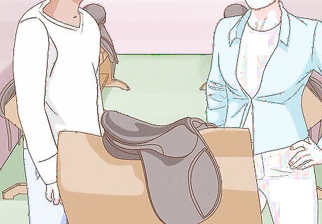 Buy a saddle and saddle blanket. The saddle helps many young and old riders stay on the horse, it is a means of providing comfort for riders over long distances. They come in many styles and varieties, and learning to size your saddle appropriately is an important part of riding. When selecting a size, make sure you have the horses height and breed as well as conformation and size. A child rider usually is a 10 inch (25.4 cm) or so, but some saddles are suited to stocky fat ponies and some are suited to elegant lanky horses. Most beginners should start with "General" or "All Purpose" saddles, though saddles come in many styles and varieties each depending on the style and purpose of riding. A Western Saddle is usually only used for Western riding, while a Jumping Saddle is used for Show Jumping. The saddle cloth should be large enough to fit the saddle and have about an inch or two all the way around the saddle. This helps protect the saddle and stops the saddle from pinching the horse.