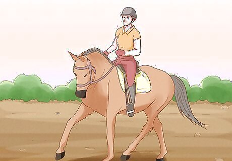 Coax the horse into motion. Urge the horse forward by gently squeezing your calves into the horse's sides. Most horses respond to verbal commands too, commonly, "giddap" or "get up" to go forward, and "whoa" to stop. Remember that you will fall eventually, if you want to ride horses, there is nothing you can do to prevent that from happening, and if you don't want to fall, don't ride a horse. It is the hard truth. No helmet will protect you from breaking a leg or getting stepped on. Remember that horses are almost 10x more powerful, strong and willing than us. Even the mini's can do an absurd amount of damage. If you don't want to get hurt, don't get on the back of a living animal.