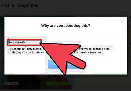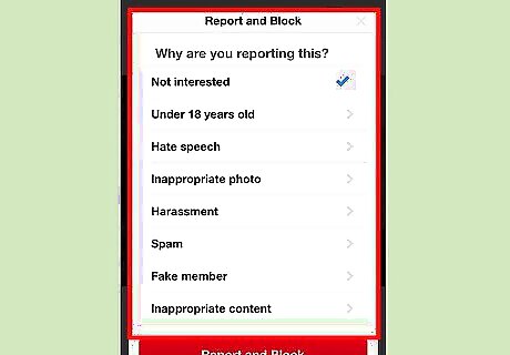 Give your reason. A new window will pop up asking why you want to block and report that person. It is in the form of a drop-down menu; the default is set to “Not Interested.” Click on the drop-down menu, and then click again on the reason you want to perform this action.