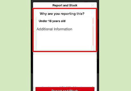 Give your reason. A pop-up window will appear on your phone's screen. If you tap the empty box at the top, you can select the reason you want to report and block this person. Once you find a suitable reason, tap on it.