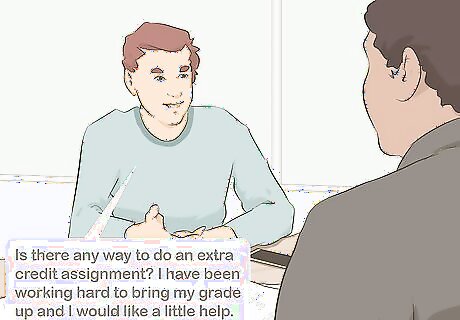 Ask about extra credit. A good way to bring your grade up is to do extra credit assignments. This can give you more points on an assignment that you failed. It can also give you an extra grade that will help bring up your overall average. Ask them your teacher, "Is there any way to do an extra credit assignment? I have been working hard to bring my grade up and I would like a little help." If they see you are serious about bringing your grade up, they might be more inclined to give you an extra credit assignment to help bring up your failing grade. You can also ask if there is a way to redo an assignment, especially if you understand the concepts better now. Say something like, "I had a hard time on the last assignment we got back. I understand it much better now that I have gotten some help and studied more. Is there a way that I can redo it?"