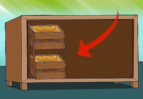 Divide the box into two nests. Try to make the nests equal in size. If you used a cabinet, lay it onto its side. Build a one-foot-deep divider across the center of the now-bottom section so that you will have two nesting boxes. You can use a shelf, a piece of plywood cut to size, or any flat slat of wood. Drive nails or screws through the back of the cabinet and into the slat. You can use the top section of the cabinet to store sawdust and egg cartons. If you need the space, you can convert it into two more nest boxes.