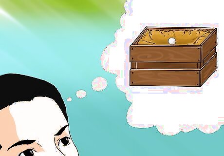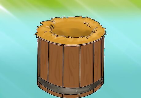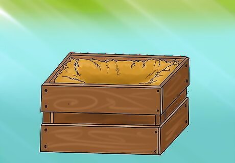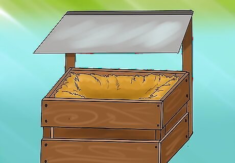 Build a 12" x 12" x 12" nesting box out of wood. Use plywood or any other large cut of cheap wood. Follow these steps to construct the basic nesting box: Cut your wood. Measure one square foot out of a piece of wood—this will be the bottom. Cut another square of the same size for the back, and one more for the bottom of the side piece. Your three squares should form a rough triangular shelter. You will need to make two such triangles. Ask a helper to hold the back of the box against the bottom while you nail/screw the pieces together. Have your helper hold one of the sides to the bottom and the back while you nail/screw the pieces together. You will need to use several nails or screws to connect the sides solidly to the bottom and the back. Repeat this process for each side. You should have an open box.