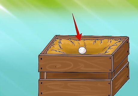 Introduce the chickens to the nesting box. Encourage chickens to use nesting boxes by placing plastic eggs or golf balls in the nests to simulate recently-laid eggs. You should collect the eggs daily, but bear in mind that chickens are more likely to add to an existing clutch of eggs than to start a new one. Keep boxes clean, and do not disturb laying chickens. Once nesting boxes are accepted as a safe and serene laying site, chickens will return daily without prodding. To introduce chickens to the nesting box, try putting them in the box at night, when they are blind. They will find their way out in the morning when they are all calm and at ease. This way, they won't forget where to find it later on. Nesting boxes are not meant to be used for sleeping. Encourage your chickens to use nests only for laying.