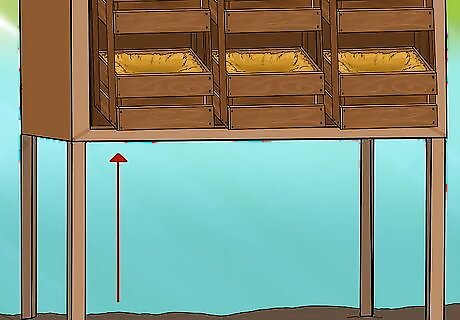 Install the nesting box two or three feet (0.6-0.9 meters) off the ground. This will discourage predators from invading, and it will prevent debris from collecting on the floor of the coop. You can prop it up on bricks, cinder-blocks, or tightly-pressed earth; nail it to the wall or hang it from the ceiling; put it onto (sturdy) stilts, or nail together a simple wooden base. Make sure that the nest boxes aren't so high that the hens have a hard time accessing them. If the nest boxes are higher than the roosts, you'll have hens sleeping inside the nest boxes.