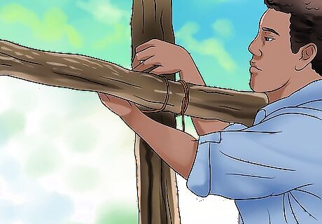 Tie the backbone in place. You will need rope or twine here. You want to tie one end of the backbone branch to each tree. Make sure you tie the rope tightly. You want the backbone as secure as possible. Place one end of the branch against the tree at about the height of your shoulder. You can use your shoulder to support the branch as you tie. Wrap your twine around the end of backbone branch. Then, bend the twine in a 90 degree angle. Wrap the twine around the tree. Bend the twine down 90 degrees again and wrap it around the branch again. Bend it 90 degrees again, and wrap it around the tree again. You're essentially forming a square with the twine that wraps around the tree and branch. Repeat this process several times until the backbone branch is securely in place. Repeat with the other end of the branch. When you're done, the backbone branch should be forming a straight line between the two trees.