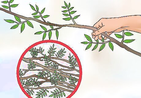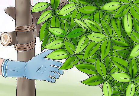 Place the leaves over the branches. Take your leaves and place them over the small branches. You want to have a solid coating of leaves covering the side of the lean-to. The leaves will insulate the shelter and help keep it warm. If possible, wear gloves during this process. When you finish, lay the smaller twigs and branches over the leaves. This will hold them in place.
