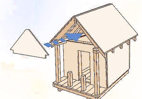 Fill in your siding by measuring the open space between your roof and the wall. The section between your wall and the angular roof will still be open. Measure this triangular section and add 2 inches (5.1 cm) to each side of your measurement so that you can nail it into the frame where it’ll rest. Measure and draw your roof siding out with a grease marker and a straight edge before cutting out your roofing material with a jigsaw or circular saw. Slide the siding behind the open area in your roof and nail it into the back of the 2 rafters and the frame at the top of the wall with a nail gun.