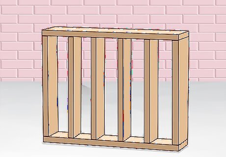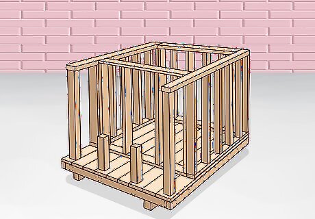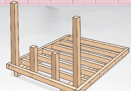 Create the frames for your walls and nail them in. Measure out the length of your first wall with a measuring tape so that it matches the joists that form the long side of the floor. Calculate the height of your wall based on the height of your taller porch posts. Lay the 4 exterior sides of your first wall out on the ground by placing 4 joists in a rectangle with your floor-length section laid parallel to the ceiling. You can use joists of the same size as the joists in your floor. You can also use 2 in × 4 in (5.1 cm × 10.2 cm), 4 in × 4 in (10 cm × 10 cm), or 4 in × 6 in (10 cm × 15 cm) joists if you’d like.
