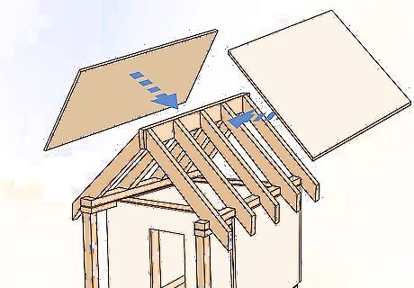 Hoist your rafters into place and cover the roof with plywood. After the rafters are resting in place, adjust the placement of your rafters by lifting and moving them along the top of your playhouse so that they sit flush with the 4 walls. Fit plywood or particle board sheets over the top of your rafters and nail them into the rafters with a nail gun to close your roof. You can add trim if you’d like to by holding pieces of finished wood against the edges and nailing them into the side of each edge with your nail gun.