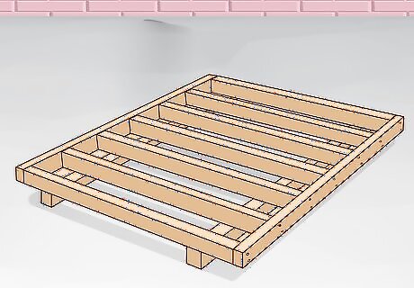 Nail your joists together and lay them out on the ground. Lay out 2 floor joists parallel on the ground. Space 5 joists 16 inches (41 cm) apart so they lay perpendicular on top of the first 2 joists with their narrow side facing up. Use a nail gun to secure the side of each joist to the floor joist beneath it by firing at an angle through the side of each joist. Nail 2 slightly longer joists into the flat exterior edges of your frame. A joist refers to any piece of wood that is used to support a structure in a building’s frame. They are typically 2 in × 6 in (5.1 cm × 15.2 cm) or 2 in × 8 in (5.1 cm × 20.3 cm). The length and size of your joists and floor joist depends on how big you want your playhouse to be. A good size for a playhouse for toddlers is 76 inches (190 cm) in length and 96 inches (240 cm) in width.