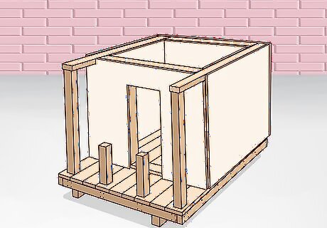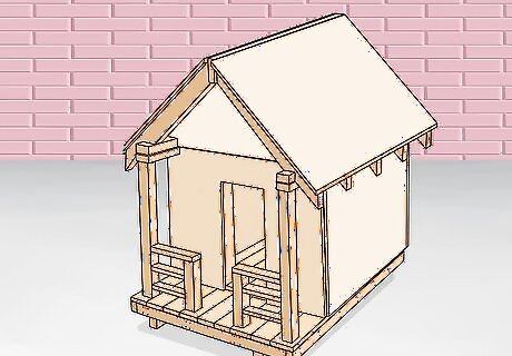 Install the sheeting for your walls on the exterior and interior of your playhouse. Use plywood or sheets of particle board and fit them across the body of your frame on the outside and inside. Fit each sheet so that it’s flush against each corner and edge. Nail each sheet into the joists that it’s covering with a nail gun by firing it directly into the joists at a 90-degree angle. Wear gloves when handling large sections of plywood or particle board. If your sheets don’t fit perfectly across each wall and section of roof, you’ll need to cut a section with a jigsaw or circular saw to fill in smaller openings. If you do, install your pieces vertically to prevent putting too much pressure on each piece.